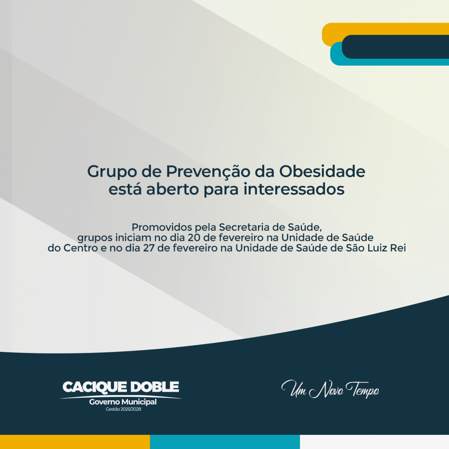 Promovidos pela Secretaria de Saúde, grupos iniciam no dia 20 de fevereiro na Unidade de Saúde do Centro e no dia 27 de fevereiro na Unidade de Saúde de São Luiz Rei Com foco na melhoria da qualidade de vida da população, a Secretaria Municipal de Saúde inicia uma série de encontros voltados ao estímulo de práticas saudáveis no dia a dia, por meio Grupo de Prevenção da Obesidade. A iniciativa busca orientar a comunidade sobre alimentação equilibrada, incentivar a perda de peso de forma segura e oferecer acompanhamento profissional contínuo, além de promover apoio coletivo entre os participantes.