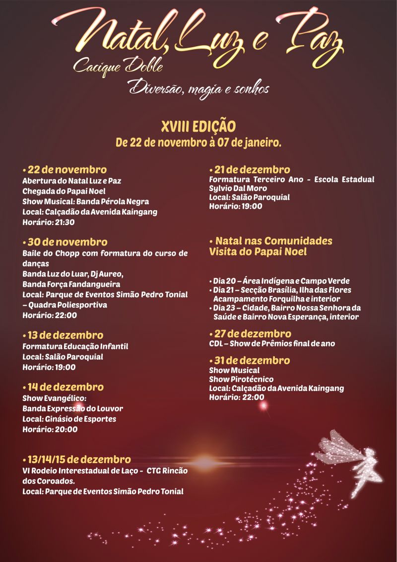 A programação da 19ª edição do Natal Luz e Paz já está à disposição da população que deseja viver este momento de diversão, magia e sonhos.