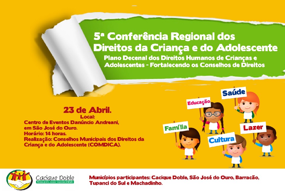 O Conselho Municipal dos Direitos da Criança e do Adolescente (COMDICA) de Cacique Doble participa no dia 23 de abril, às 14h, da 5ª Conferência Regional dos Direitos da Criança e do Adolescente. Este ano, o encontro que tem como tema o Plano Decenal dos Direitos Humanos de Crianças e Adolescentes - Fortalecendo os Conselhos dos Direitos da Criança e do Adolescente, será realizado em São José do Ouro, no centro de eventos Danúncio Andreani, reunindo cinco municípios da região.