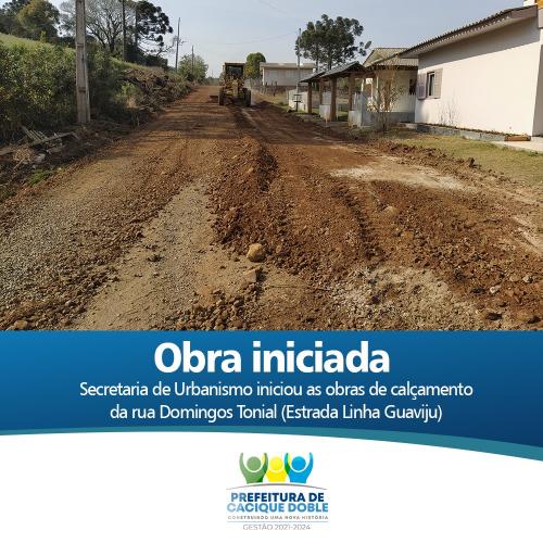 Iniciaram nesta segunda-feira, dia 09 de agosto, as obras de preparo da rua Domingos Tonial (Estrada Linha Guaviju) que receberá calçamento com paralelepípedo. As obras são da Secretaria de Urbanismo em parceria com a pasta de Obras.
