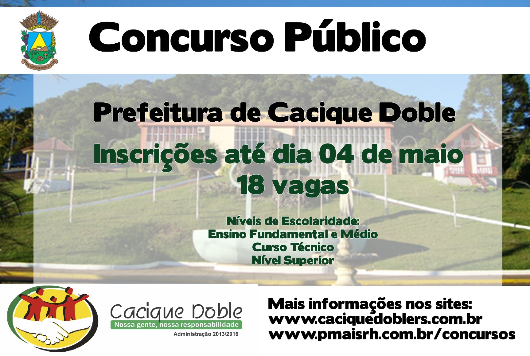 Prefeitura Municipal de Cacique Doble está com inscrições abertas para concurso público com 18 vagas para contratação imediata. As inscrições vão até o dia 4 de maio. Os salários variam de R$ 858,44 a R$ 6.218,96 de acordo com o cargo escolhido.