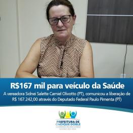 O Deputado Federal Paulo Pimenta (PT), por meio da vereadora Sidnei Salette Carniel Olivotto (PT), comunicou a liberação e depósito de R$ 167.242,00 do Fundo Nacional da Saúde ao município. O recurso será destinado à Secretaria Municipal de Saúde para aquisição de um veículo para transporte de pacientes.
