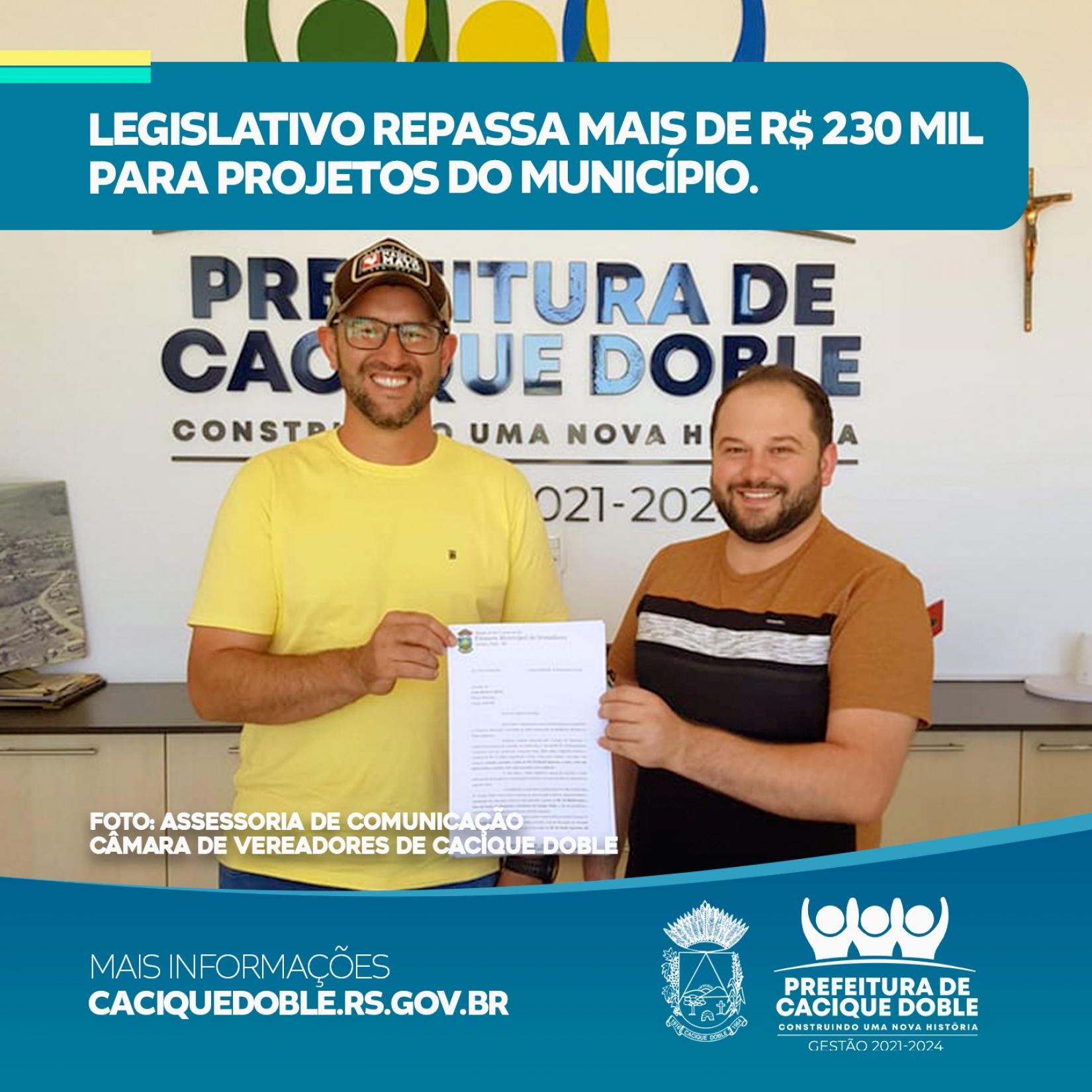 O ofício foi entregue na manhã desta quarta-feira, dia 12 de janeiro, pelo ex-presidente da Câmara de Vereadores de Cacique Doble, Álvaro Rotini. O saldo total é de R$ 232.463,99, com indicação para que valor seja aplicado na realização das seguintes obras: