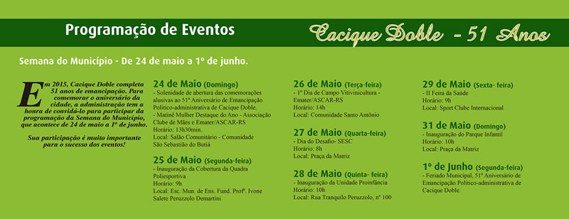 - Feriado Municipal, 51º Aniversário de Emancipação Político-administrativa de Cacique Doble.