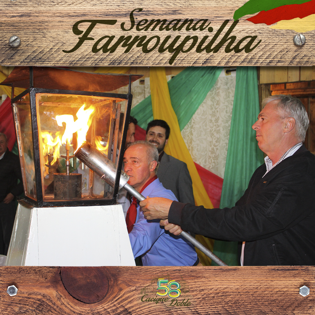 Aberta oficialmente a Semana Farroupilha de Cacique Doble. Em evento realizado na noite desta terça-feira, dia 13 de setembro, na sede do CTG Fogo de Chão, o Prefeito Municipal Luiz Ângelo Deon acendeu a pira farroupilha com a chama trazida pelos patrões dos CTG's Rincão dos Coroados, Porteira Serrana e Fogo de Chão.
