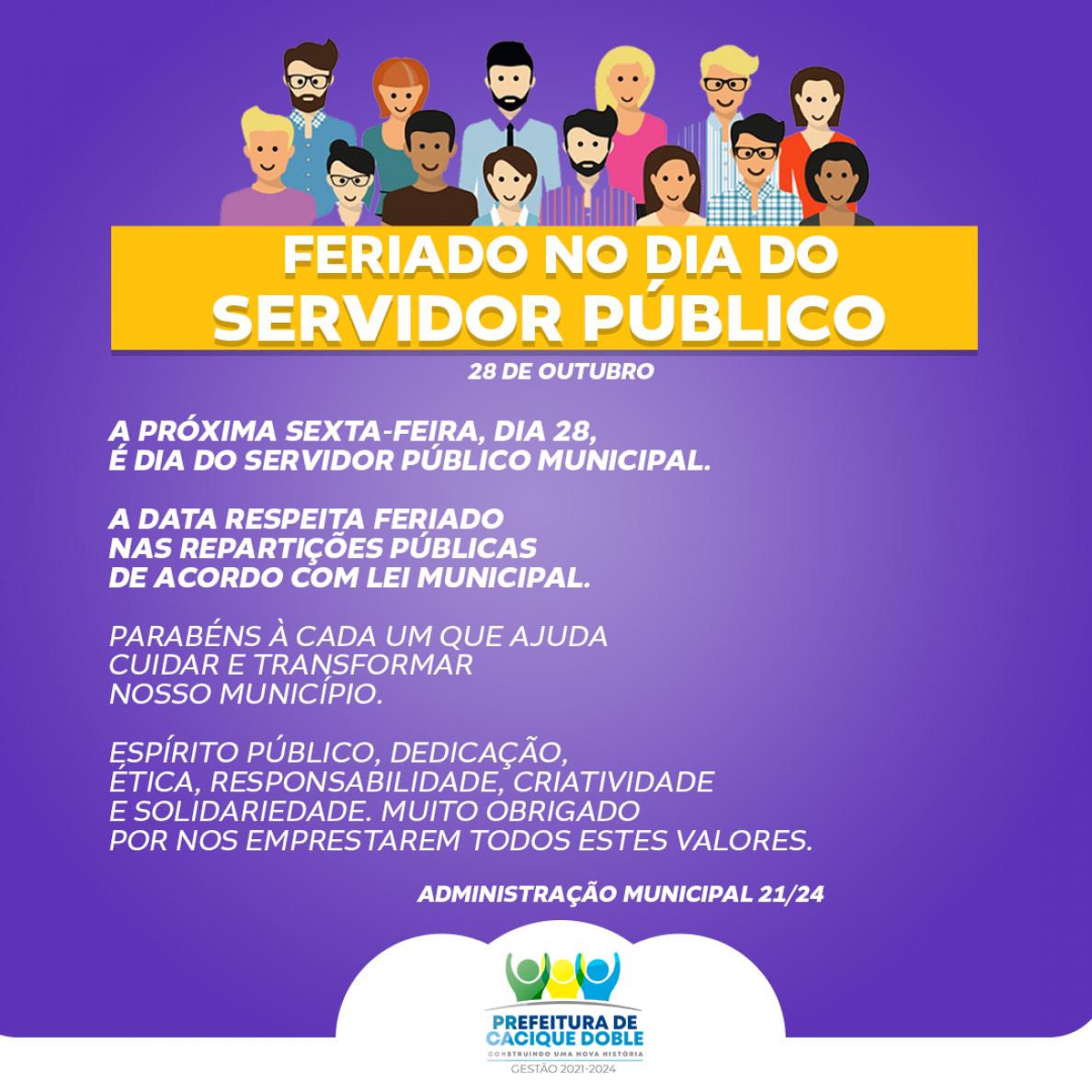 De acordo com a Lei Municipal 976/2007, nesta próxima sexta-feira, dia 28 de outubro, as repartições públicas municipais respeitam feriado do Dia do Servidor Público. Não haverá expediente nos setores neste dia.