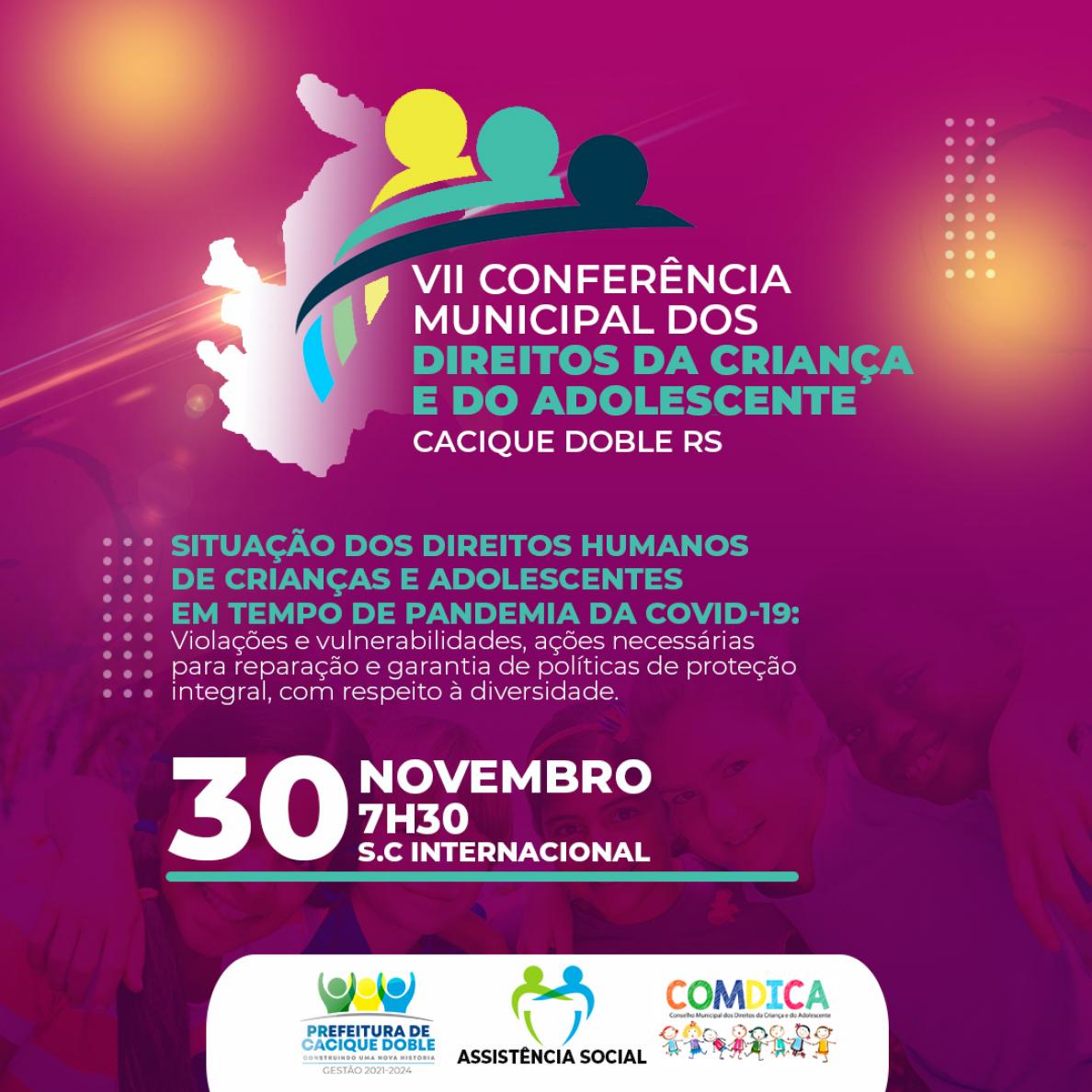 No dia 30 de novembro, o COMDICA (Conselho Municipal dos Direitos da Criança e do Adolescente), promovem a VII Conferência Municipal dos Direitos da Criança e do Adolescente. O Tema Central da Conferência é a “Situação dos direitos humanos de crianças e adolescentes em tempo de pandemia da covid-19: violações e vulnerabilidades, ações necessárias para reparação e garantia de políticas de proteção integral, com respeito à diversidade”.