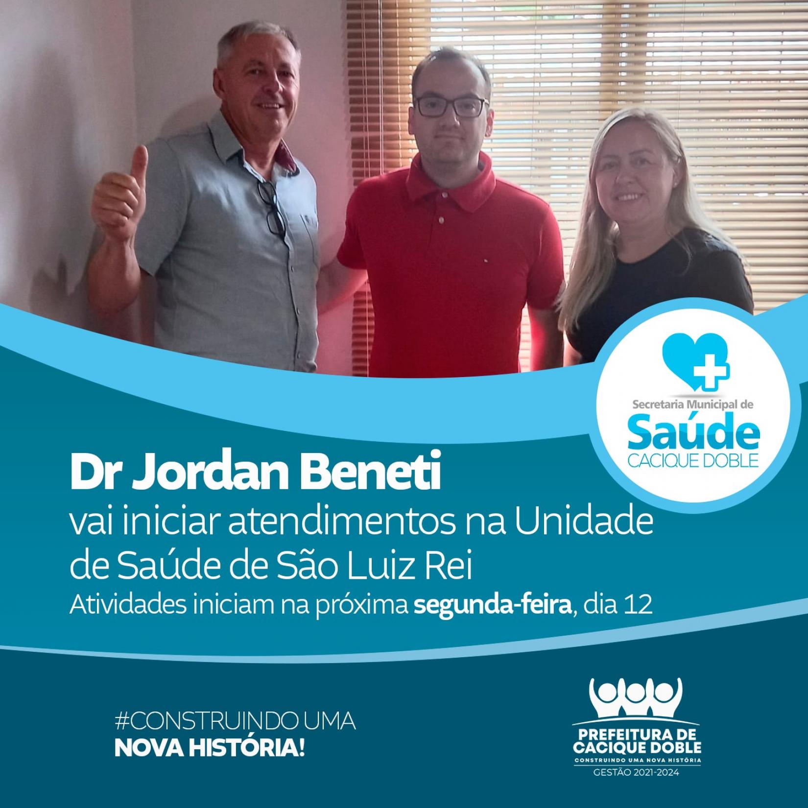A Administração Municipal apresenta o Dr. Jordan Beneti, médico indicado pelo Programa Médicos Pelo Brasil. O Dr Beneti fará atendimentos na Unidade de Saúde de São Luiz Rei a partir do dia 12 de dezembro.