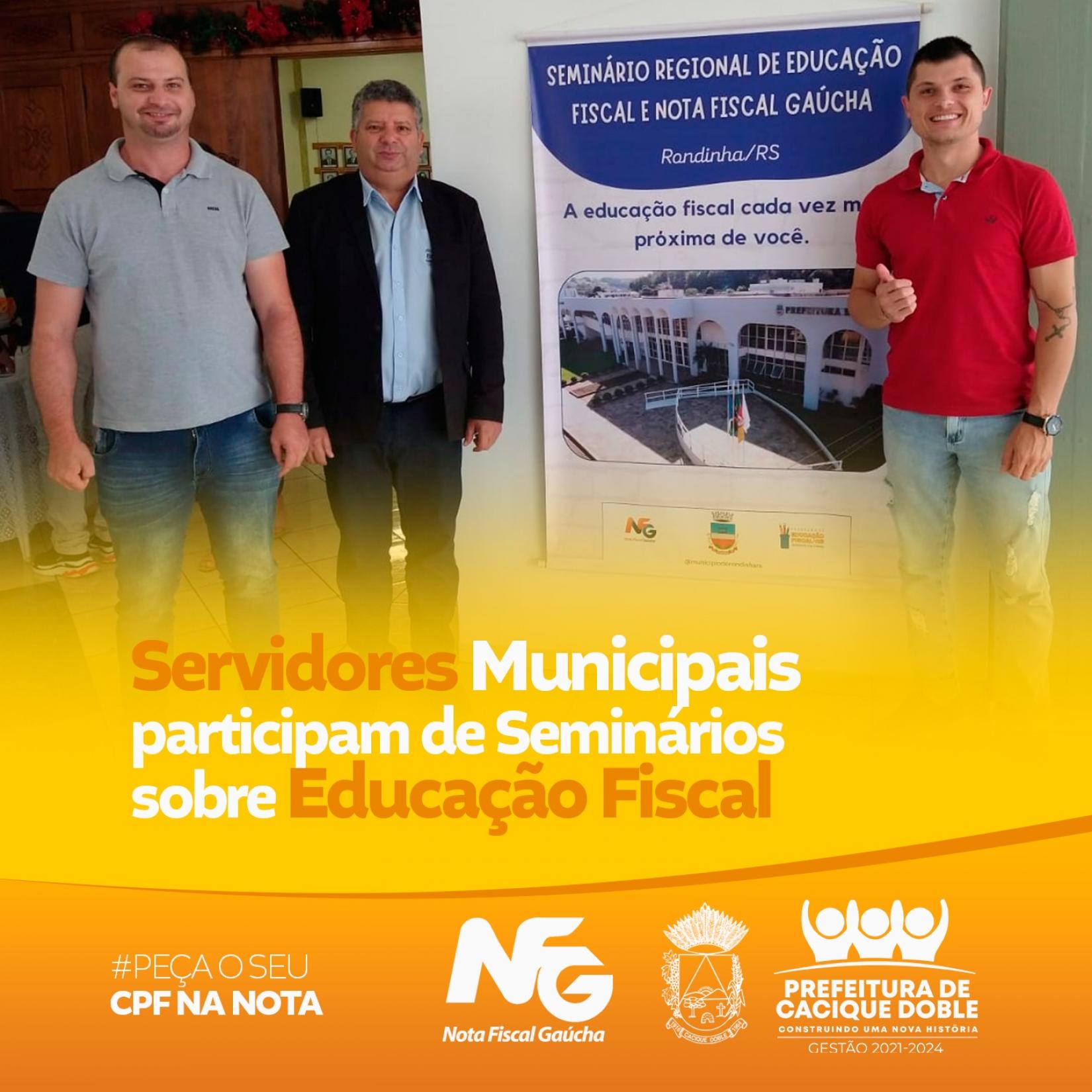 Os Servidores municipais Edivan Navarini e Jean Carlo Buziki, participaram dos Seminários Regionais de Educação Fiscal, e nota fiscal Gaúcha nas cidades de Derrubadas RS e Rondinha RS nos dias 29 de 30 de março. Nos eventos, os representantes fiscais de Cacique Doble puderam acompanharam as apresentações das boas práticas de Educação Fiscal realizadas naqueles municípios pelas escolas da rede municipal de ensino.