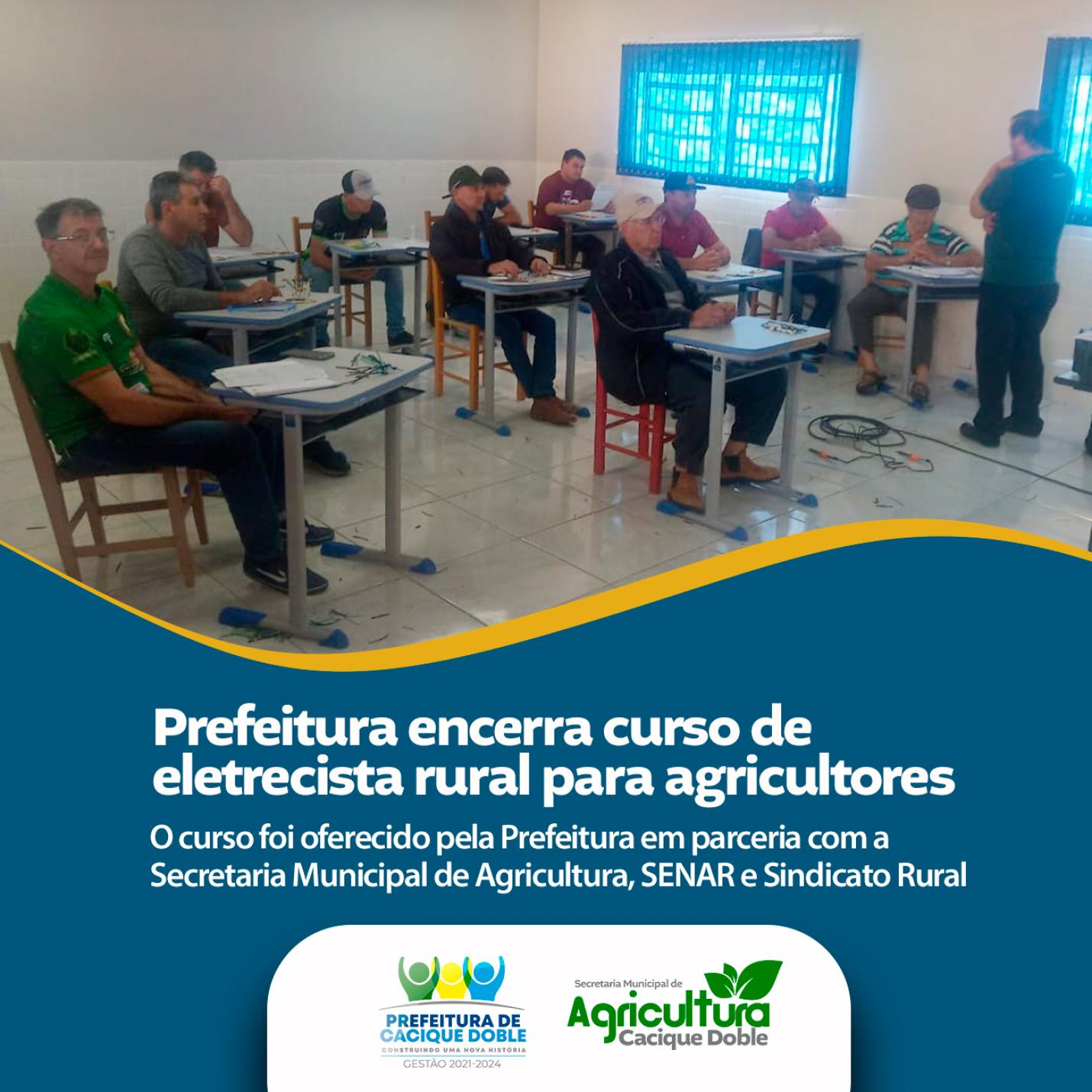 O Governo Municipal de Cacique Doble segue ofertando oportunidades para os caciquenses, em especial aos produtores rurais, agricultores e pecuaristas. Na última semana de agosto, a Prefeitura em parceria com a Secretaria Municipal de Agricultura, SENAR e Sindicato Rural, concluiu o curso de Eletricista Rural.
