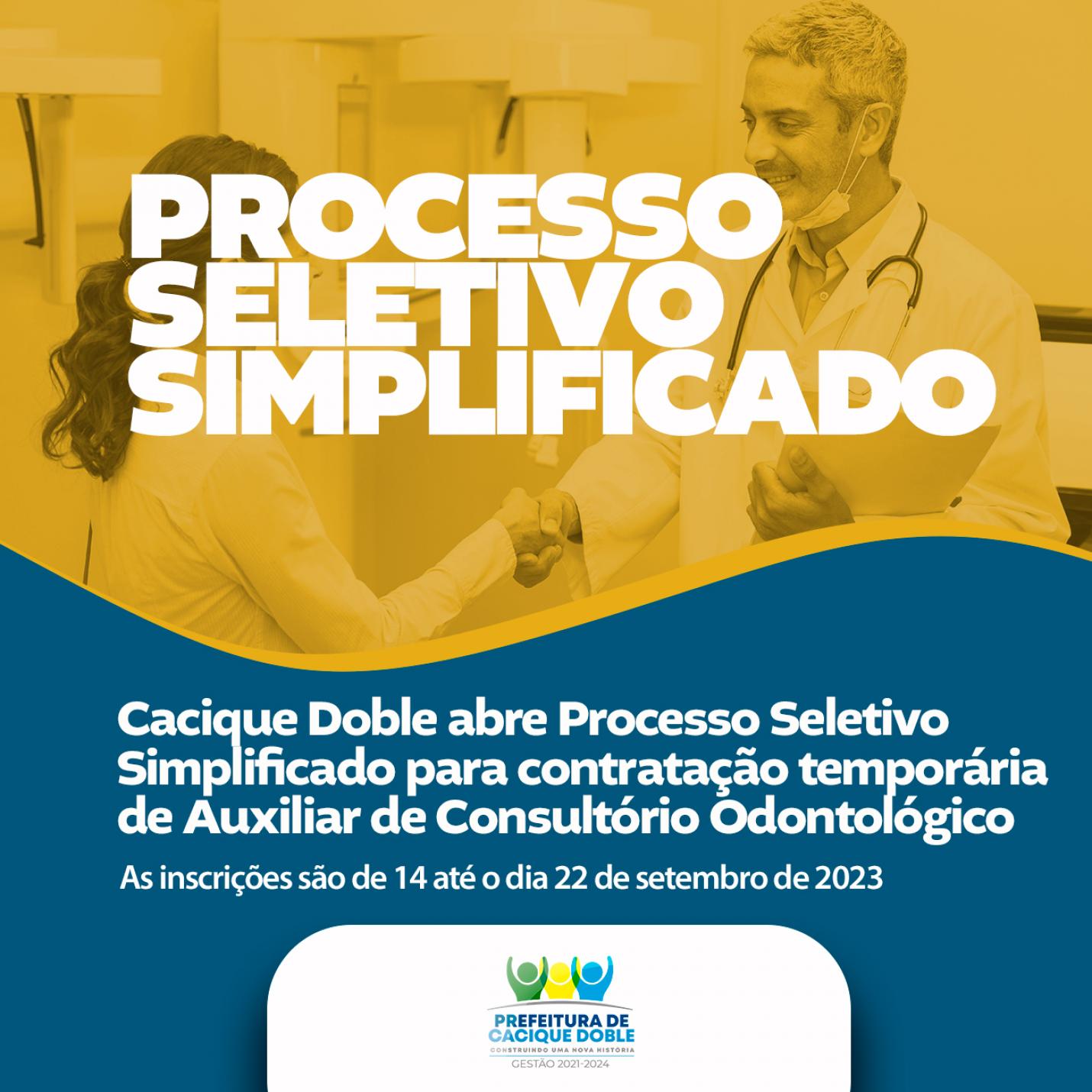 A partir desta quinta-feira, dia 14, o Governo Municipal de Cacique Doble abre as inscrições para o Processo Seletivo Simplificado 004/2023 para contratação temporária de Auxiliar de Consultório Odontológico.