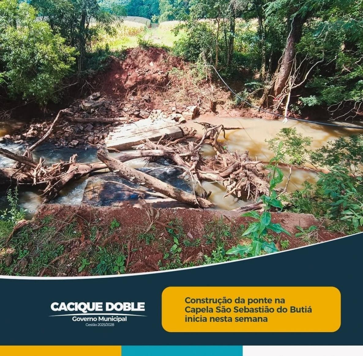 O governo municipal de Cacique Doble informa que está definida a data para início da obra de construção da nova ponte na Capela São Sebastião do Butiá. A comunidade, principalmente quem usa com frequência a via, precisa ficar atenta, pois a nova ponte começa a ser construída nesta quarta-feira, dia 15 de janeiro. Devido à obra, a via seguirá interrompida ao longo do período de construção, que é de 3 meses.