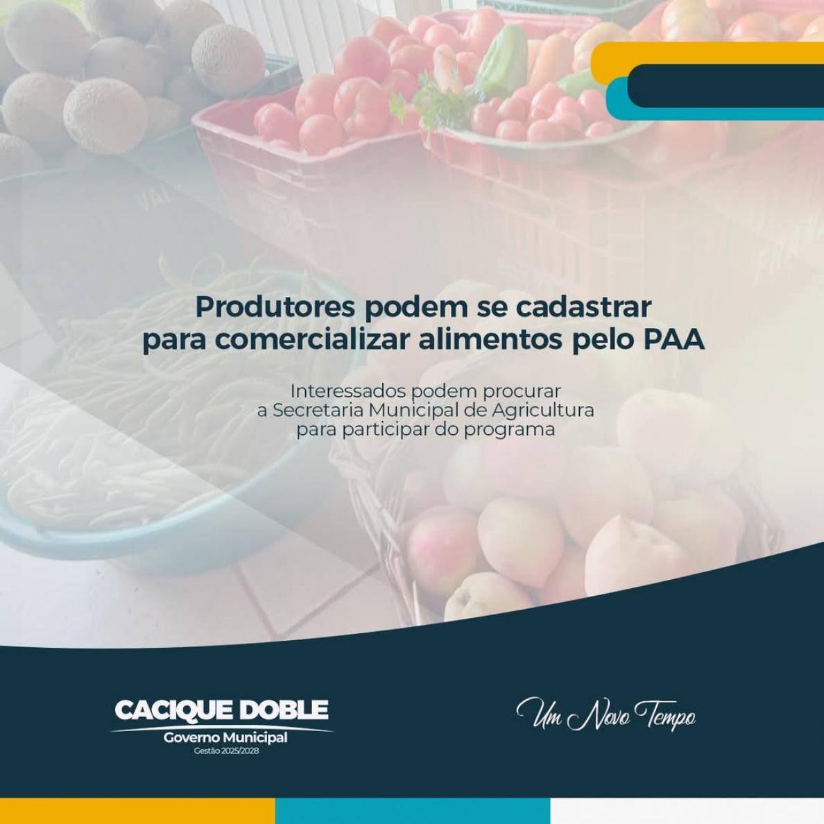 A Secretaria Municipal de Agricultura de Cacique Doble informa que estão abertas as inscrições para os produtores rurais interessados em participar do Programa de Aquisição de Alimentos (PAA). O município dispõe de R$ 70 mil, oriundos do programa, para a execução desta importante iniciativa, que visa fortalecer a agricultura familiar e contribuir para a segurança alimentar da população em situação de vulnerabilidade.