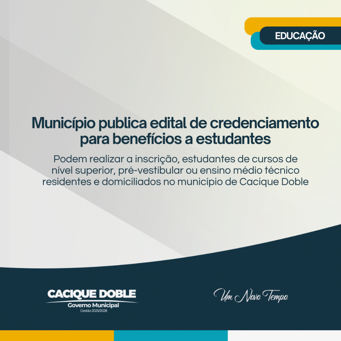 O município de Cacique Doble anuncia a abertura do credenciamento para a concessão de benefícios destinados a estudantes que frequentam regularmente cursos de nível superior, pré-vestibular ou ensino médio (cursos técnicos). O edital, regulamentado pela Lei Municipal nº 1.400/2019, foi publicado nesta quarta-feira, dia 22 de janeiro e as inscrições podem ser realizadas a partir da próxima segunda-feira, dia 27 de janeiro.