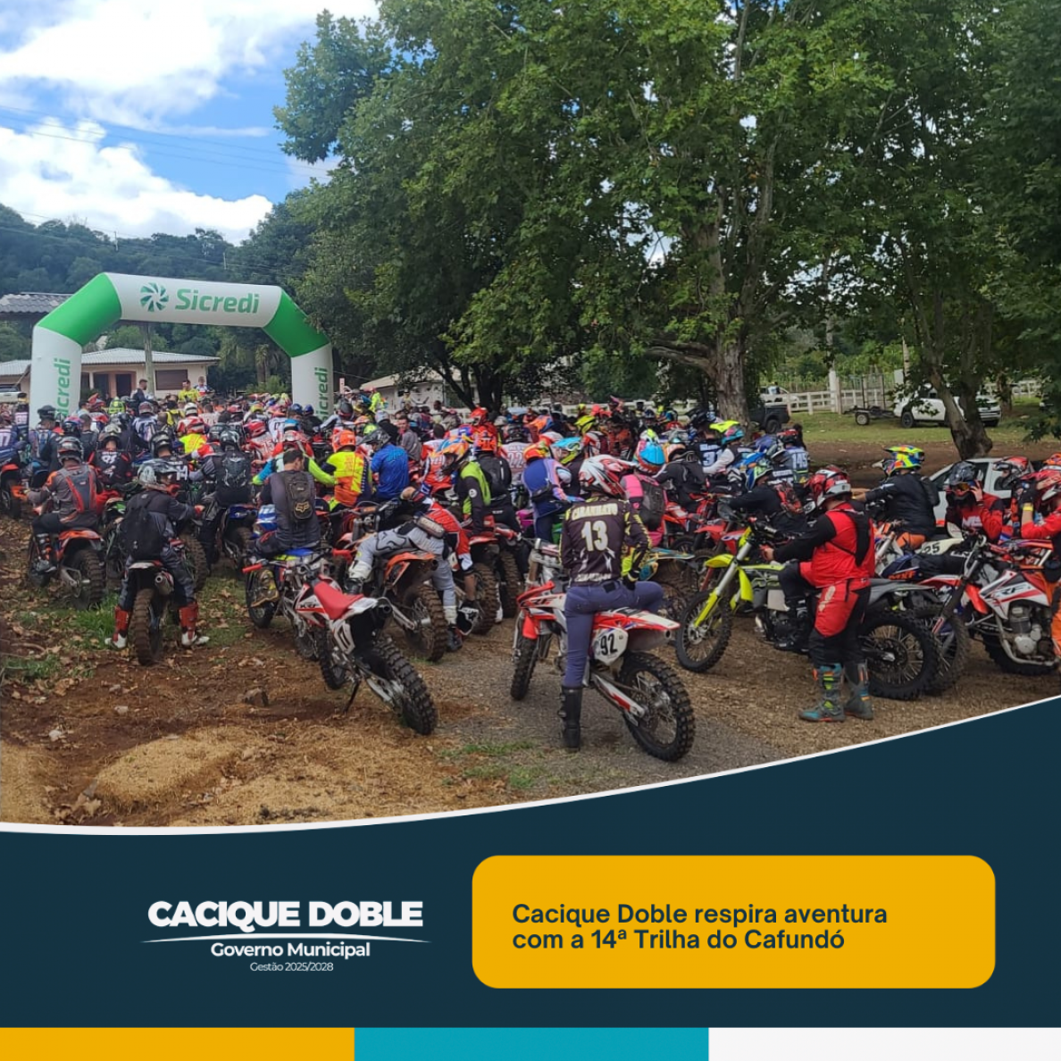 O evento conta com o apoio do Governo Municipal de Cacique Doble e reúne mais de 800 trilheiros inscritos, vindos de 90 cidades do Rio Grande do Sul e Santa Catarina, além de atrair competidores renomados do Paraná e São Paulo. Ao lado dos participantes, familiares, amigos e espectadores acompanham cada momento dessa aventura, que transforma o município em um grande palco de adrenalina e integração.