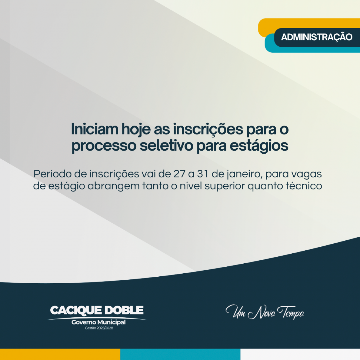 Iniciaram nesta segunda-feira, dia 27 de janeiro, as inscrições para o Processo Seletivo Simplificado destinado ao preenchimento de vagas e à formação de cadastro reserva para estagiários. As inscrições seguem abertas até sexta-feira, dia 31 de janeiro, das 8h às 11h e das 13h30min às 17h, na Secretaria Municipal de Educação.